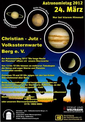 Und ausgerechnet für diesen Samstag will sich die Christian-Jutz-Volkssternwarte Berg am deutschlandweiten Astronomietag “Die lange Nacht der Planeten” beteiligen – am Nachmittag ist von 13-15 Uhr und am Abend von 19-22 Uhr kostenlos geöffnet.