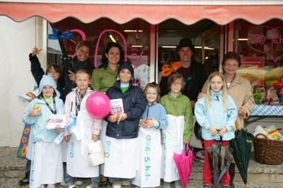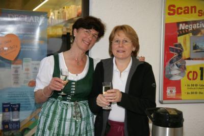 Ein Gläschen hilft gegen alles, auch gegen Regen: Frau Höck (Drogerie) und Frau Lidl (Bäckerei)