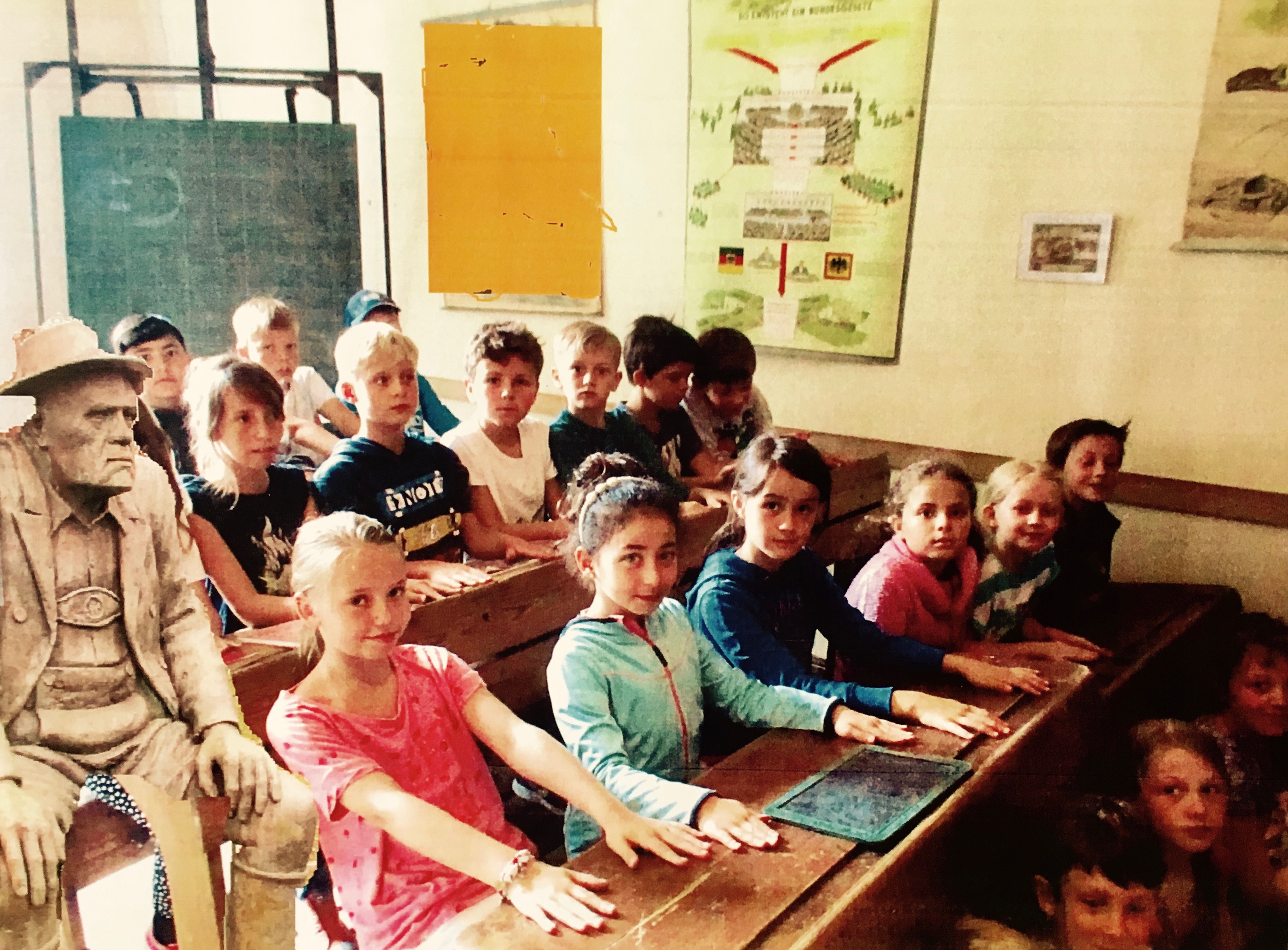 In den höheren Klassen wagte man sich gar mit Filmen oder Computercollagen an das Thema heran: So wie auf diesem köstlichen Bild, für das ein*e Schüler*in den gemeinsamen Besuch im Schulmuseum in Aufkirchen mit der Graf-Statue collagierte: