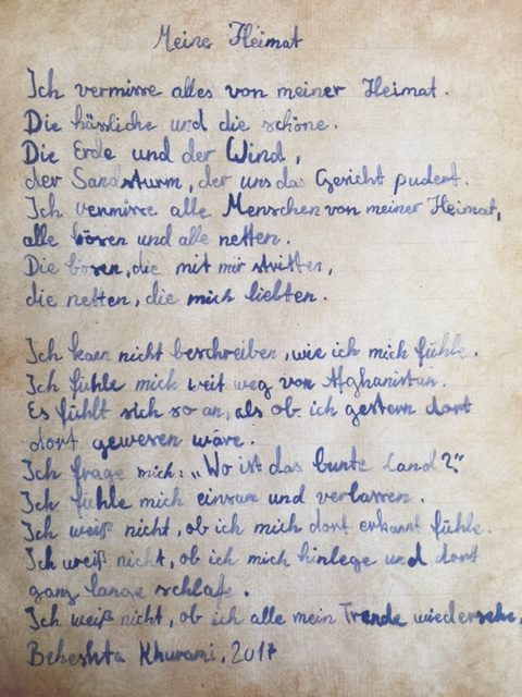 Berückend schön war der Oskar Maria Projekttag der gleichnamigen Berger Volksschule. Alle Klassen hatten sich eine Woche mit den Themen “Oskar Maria Graf” und “Heimat” beschäftigt und präsentierten in ihren Klassenräumen am “Tag der offenen Tür” ihre Arbeitsergebnisse, die manchen der zahlreichen Besucher fast die Tränen in die Augen trieben. Zum Beispiel dieses Gedicht einer aus Afghanistan geflüchteten Schülerin der 4. Klasse: