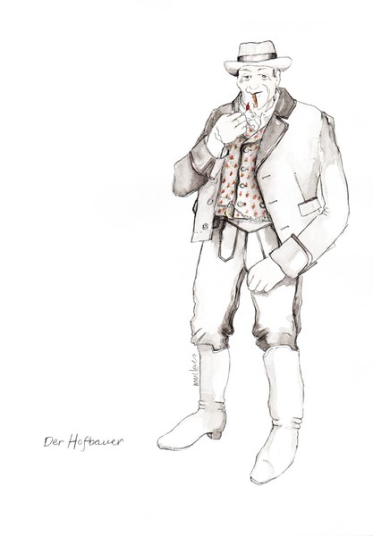 Die Ausstellung im Rathaus präsentiert Bilder, die sich mit dem aktuellen Zeitgeschehen beschäftigen, zusätzlich Zeichnungen der berühmten Charaktere der Commedia dell’arte, Truffaldino und die Pulcinelli, die delikaten Rokoko-Silhouetten aus Peter Shaffers „Amadeus“ und das Personal aus Ludwig Thomas beliebter Komödie „Die Witwen“ sowie Sammlungen kleiner Stoffproben.