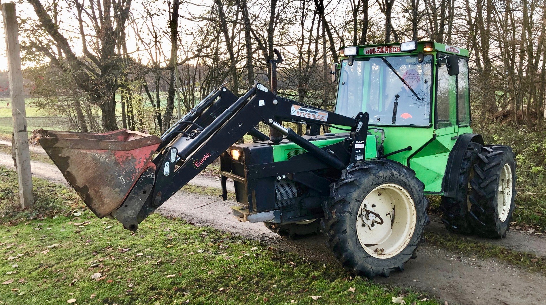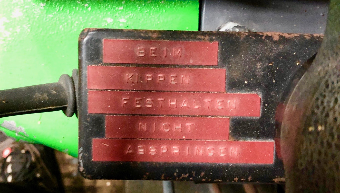 Besonderheiten: Der Traktor, dessen augenscheinlichste Besonderheit natürlich die Knicklenkung ist, besitzt eine möglicherweise lebensrettende, nachträglich angebrachte Handlungsanweisung in Prägebandschrift für das Verhalten beim Umfallen der Zugmaschine: “Beim Kippen festhalten, nicht abspringen”.
