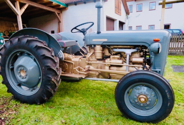 Besonderheiten: Etwas Schöneres hätten wir uns für unseren “Weihnachtstraktor”, das Christkindl, nicht wünschen können als einen mit güldener Maschine. Als er 2005 im Rottal gekauft wurde (Gelegenheitskauf), war der Zustand zwar schlecht aber machbar. Der Schlepper trägt den Namen „Goldbauch“, ist Erfinder des hydraulischen Hubmechanismus. Er hat interessante Kennwerte z.B. Geschwindigkeit im untersten Gang : 500 m je Stunde ! Frau Punscher besitzt das Ferguson-Gen seit ihrer Kindheit. Der Vater kaufte damals in München bei Fa. Walk einen Schlepper des gleichen Herstellers. Das Nervigste an dem Schlepper sind die ständigen Nachfragen in Sachen Lackierung: NEIN – der Weihnachtsschlepper ist ORIGINAL GOLD. Sicher. Ja, schon immer!