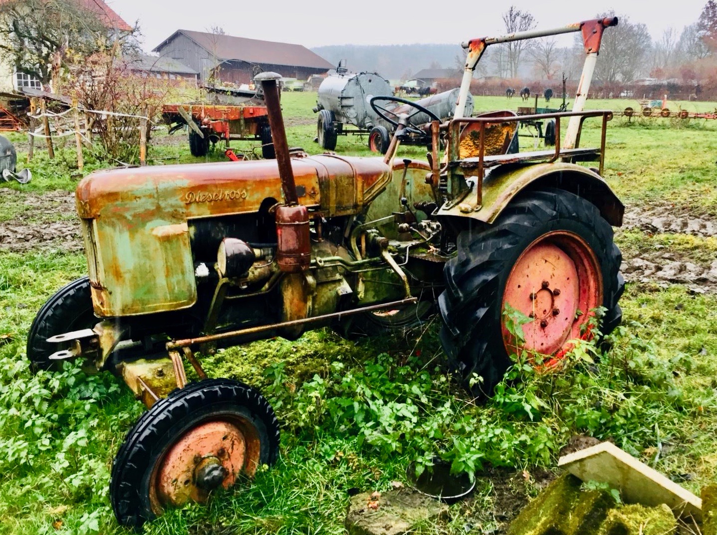 Besonderheiten: Der luftgekühlte Traktor ist seit Anbeginn im Besitz der Familie Galloth, aber – wie auf dem Foto unschwer erkennbar – derzeit nicht fahrbereit.