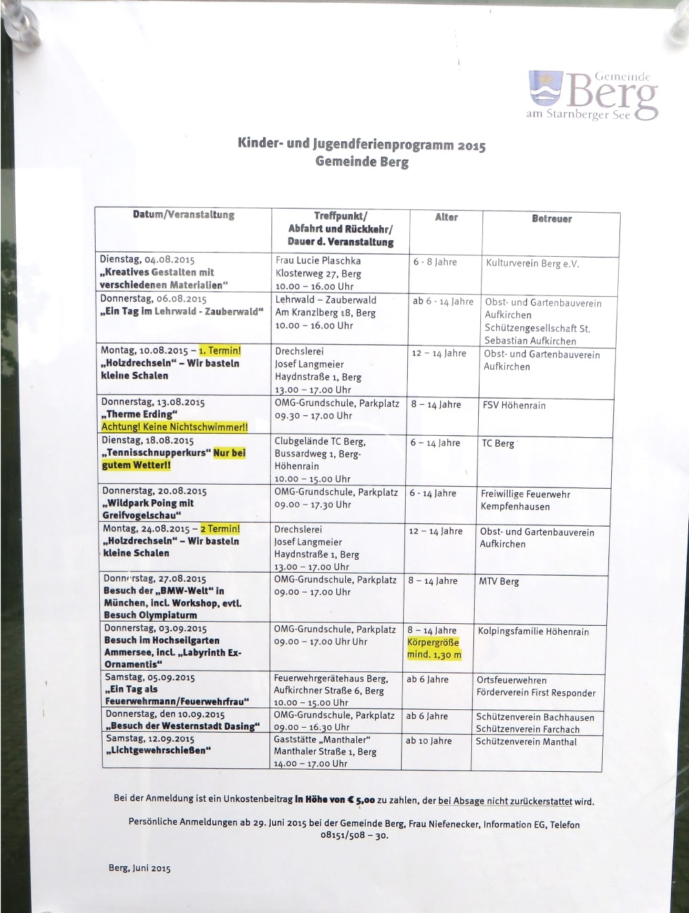 Holzdrechseln, Hochseilpark oder doch zur Feuerwehr? Hauptsache jetzt schon anmelden! Das Kinder- und Jugendferienprogramm der Gemeinde Berg für den Sommer 2015 ist da.