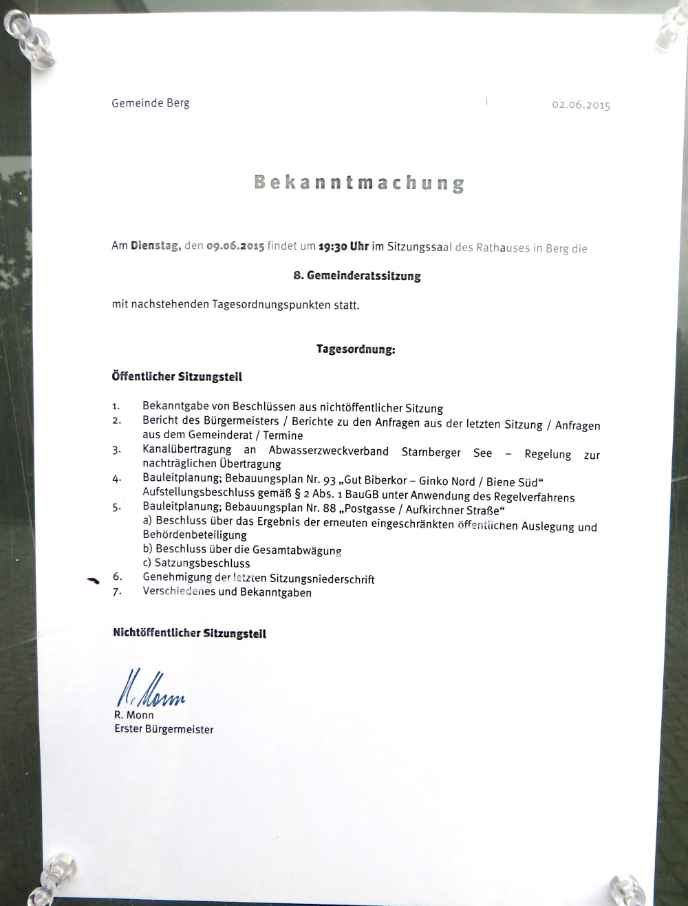 Auch wenn nicht allzuviel los ist: Es gibt neue Bekanntmachungen in den Schaukästen der Gemeinde Berg. Hier in der digitalen Version der QUH: