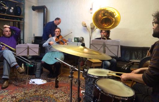 Die Münchner Allstarband “Hochzeitskapelle” (mit Mitgliedern von “The Motwist”, “Zwiebeldirn” und “Alien Ensemble” bei der Probe)