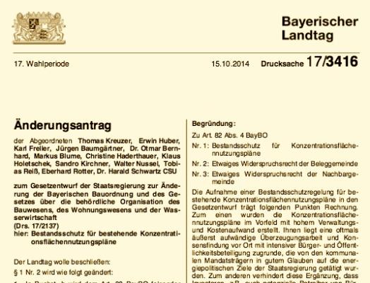 “Die Aufnahme einer Bestandsschutzregelung für bestehende Konzentrationsflächennutzungspläne in den Gesetzentwurf trägt folgenden Punkten Rechnung. Zum einen wurden die Konzentrationsfläche-nnutzungspläne im Vorfeld mit hohem Verwaltungs- und Kostenaufwand erstellt. Ihnen liegt eine oftmals äußerst aufwändige Überzeugungsarbeit und Konsensfindung vor Ort mit intensiver Bürger- und Öffentlichkeitsbeteiligung zugrunde, die von den kommunalen Mandatsträgern in gutem Glauben auf die energiepolitischen Ziele der Staatsregierung getätigt wurden. Zum anderen verhindert diese Ergänzung, dass Investoren, z.B. auch potenzielle Betreiber von Bürgerwindrädern, sich in ihrem Vertrauen auf die Konzentrationsflächendarstellung enttäuscht und in ihren Aufwendungen frustriert sehen.