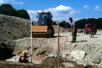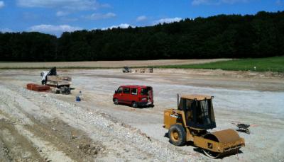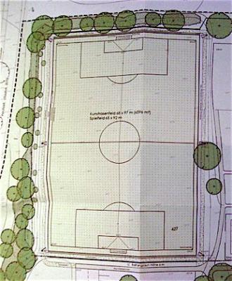 Auf den Wall wird noch eine zusätzliche Humusschicht aufgetragen und diese dann beplanzt. Obenauf muß dann noch ein Zaun! Die Bauarbeiten am Treiningsplatz selbst sind eigentlich recht fortgeschritten. Die Ausmaße des Platzes sind bereits erkennbar. Allerdings gibt es derzeit ein paar Probleme mit dem Untergrund, der nicht fest genug erscheint. Wahrscheinlich muß noch eine Schicht aufgetragen werden, was Verein und Gemeinde Zeit und Geld kosten wird.
