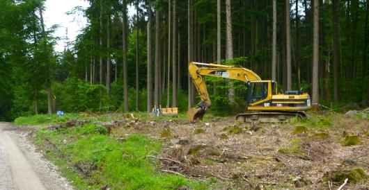 Hier – in der Nähe der Autobahn – ist man stellenweise noch dabei, den Waldweg zu verbreitern, wofür erst noch die Baumstrünke entfernt werden müssen.