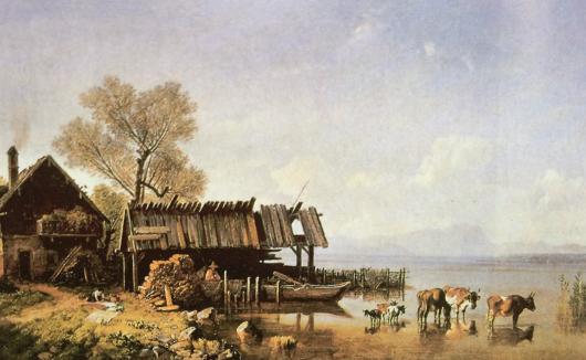 Heinrich Bürkel (1802-1869), Bootshütten am See bei Berg, um 1858