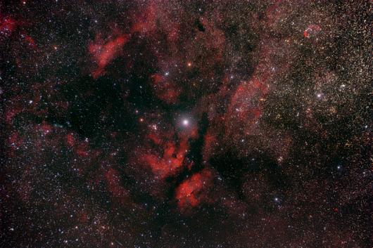Viel drauf auf dem Bild, das uns die Christian Jutz Volkssternwarte Berg heute überlassen hat. In der Mitte sehen wir Gamma Cygni, das Zentralgestirn des Sternbildes Schwan, auch bekannt als Sadir oder Sadr – ein arabisches Wort, das soviel wie Hühnerbrust bedeutet. Eine nette Bezeichnung für ein Objekt, das ungefähr den 150 fachen Sonnenradius besitzt und ungefähr 33.000 Mal soviel Energie ausstrahlt. Das Ungestüme des Sternchens kommt von seiner Jugend. Sadr ist nur gut 12 Millionen Jahre alt. Um ihn der 100 Lichtjahre große Nebel IC 1318, vulgo: Schmetterlingsnebel.