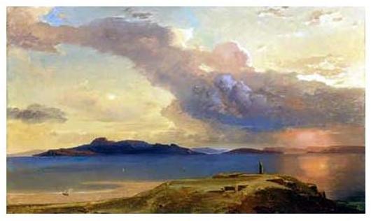 Carl Rottmann (1797-1850), Ägina – Apollotempel, 1836. – Eine wunderliche Geschichte gibt es zum heutigen Bild, das zwar laut Titel den Äginatempel in Griechenland darstellt, laut einer Notiz auf der Rückseite des Bildes aber die Wolkenbildung und Landschaft vom Starnberger See im Jahr 1836 darstelle.