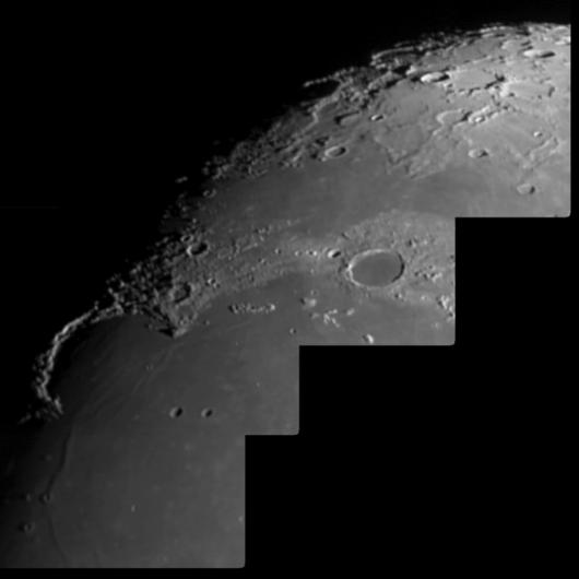 Der Mond, genauer der Krater Plato, der sich in den Alpen (Montes Alpes) des Mondes befindet, so wie er von den terrestrischen Alpen aus gesehen werden kann (Christian Jutz Volkssternwarte Berg). Der Kraterrand erhebt sich 2400m über dem Kraterboden.