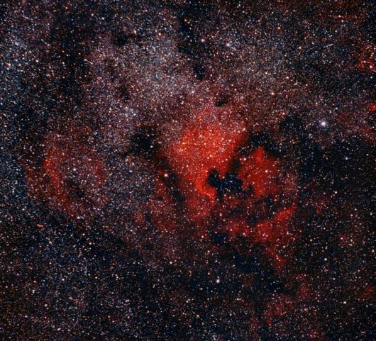 Heute mal kein Messier-Objekt: NGC 7000 ist ein diffuser Gasnebel. Hier in der diffusen Form von Nordamerika, weshalb er einerseits auch als Nordamerikanebel bekannt ist, weshalb man andererseits von der Christian Jutz Volkssternwarte Berg aus direkten Blick bis nach Nordamerika im Sternbild des Schwans hat.