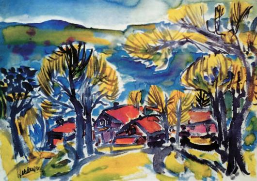 Walter Habdank (1930-2001), Bei Berg. Walter Habdank verdanken wir dieses Aquarell, das deshalb bemerkenswert ist, weil es nicht nur eine Ansicht von Berg zeigt (welche?), sondern auch von einem Künstler stammt, der von 1979 bis zu seinem Lebensende in unserer Gemeinde gewohnt hat.