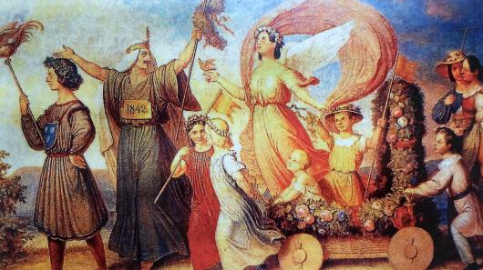 Friedrich Georg Dürck (1809-1884), Festzug in Leoni, 1842; der Maler dieses eigenartigen Gemäldes, das den Festzug zur Einweihung der Himbsel-Villa darstellt, geht mit arabischem Kostüm voran; offenbar verstand man es damals in Leoni zu feiern.