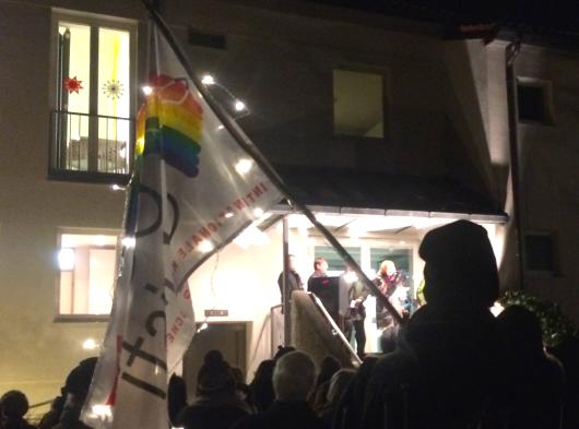 Starnberg zeigte Flagge – wie viele Banner allerdings geschwenkt würden, war nicht absehbar. Der Kirchplatz war vom Eis verzaubert, und so fand man auf dem Gelände der evangelischen Friedenskirche Asyl für die heutige Kundgebung “Starnberg setzt ein Zeichen. Für eine offene, tolerante und demokratische Gesellschaft”. Der Starnberger Initiator Rainer Hange bekam im Vorfeld Unterstützung von CSU, SPD, den Grünen, FDP, BMS, den Piraten und dem Ausländerbeirat. Er stellte eine ansehnliche Rednerliste zusammen: Nach der 1. Bürgermeisterin Eva John und dem 3. stellvertretenden Landrat Tim Weidner sprachen Sabine Leutheusser-Schnarrenberger, Bundesjustizministerin a.D., und Benjamin Idriz, Imam der Gemeinde Penzberg, sowie der evangelische Pfarrer Dr. Stefan Koch.