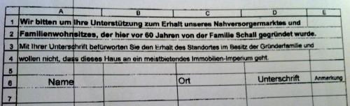 Aus diesem Grund hat er am letzten Wochenende versuchsweise eine Unterschriftenaktion gestartet. Er stellte sich selbst an einen Tisch im Lebensmittelmarkt und legte die Listen aus. Innerhalb von 24 Stunden hatte er schon ca. 260 Unterschriften beisammen – allerdings erwähnte er weder Frau Brandl noch Vinzenzmurr, sondern formulierte unkonkret: “Mit Ihrer Unterschrift befürworten Sie den Erhalt des Standortes im Besitz der Gründerfamilie und wollen nicht, dass dieses Haus an ein meistbietendes Immobilien-Imperium geht.”