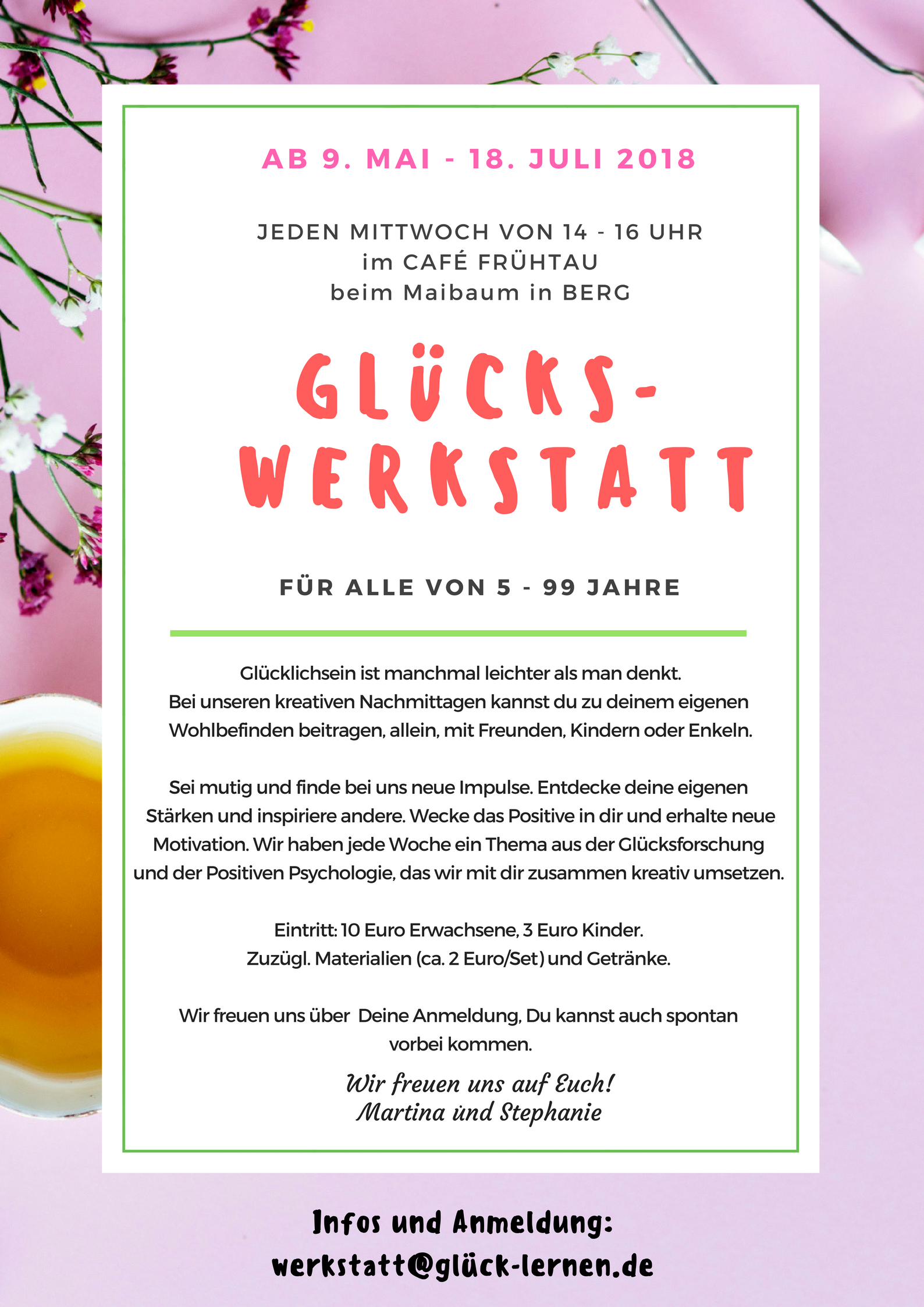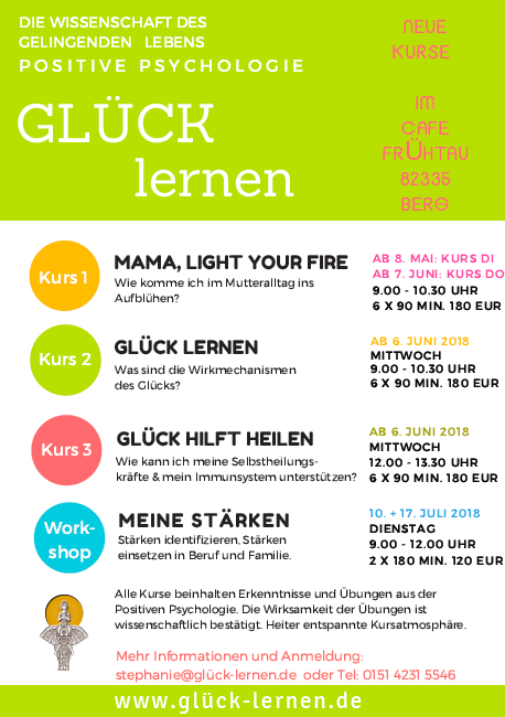 Jeden Mittwoch bis zum 18. Juli, jeweils von 14 bis 16 Uhr, werden Themen aus der Positiven Psychologie vorgestellt und kreativ umgesetzt. Zu den Basteleien rund um das Glück sind alle zwischen 5 und 99 Jahren willkommen., der Eintritt beträgt 10 € für Erwachsene und 3 € für Kinder.