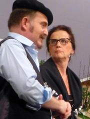 Ein Erfolg in drei kurzweiligen Akten – natürlich! – Aber was hatte Hildegard dann mitten in den Schlußapplaus hinein noch zu verkünden? “Jetzt”, rief sie erleichtert nach der Vorstellung ins Publikum und zeigte damit, wer der Chef im Dorf ist, “jetzt kann der Bürgermeister kommen und uns unsere Blumen überreichen.” – Das tat der Amtsinhaber, der den ganzen Abend mit Elke Link und Andreas Ammer von der QUH zusammen am Tisch (über Windkraft?) getuschelt hatte, dann auch folgsam. Noch größerer Applaus!