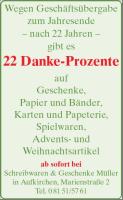 Meinen Kunden biete ich bis zum Jahresende 22 Prozent Danke-Rabatt auf Geschenke, Papier & Bänder, Karten & Papeterie, Spielwaren und Advents- und Weihnachtsartikel. Das gilt ab sofort.