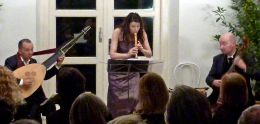 Höhepunkt des Abends war zweifellos der “Barock-Hit” “La Follia” von Arcangelo Corelli, der gleich zweimal gegeben wurde: einmal in einer Solofassung für Flöte und dann noch einmal zusammen mit Laute und Cello. Daraus auch unser Minutenausschnitt: