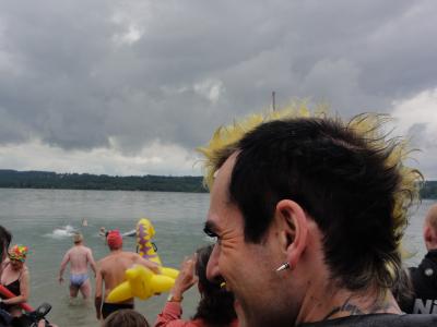 Da die Genehmigung für die Veranstalter ziemlich überraschend kam, war das Programm ein wenig improvisiert. Immerhin versammelten sich gut 100 Zuschauer und viel Presse, um dem bunten Volk beim Baden zuzusehen. Die Polizeipräsenz wurde gegenüber dem Ehrenzug am Vormittag leicht verstärkt – laut Aussage der Polizei allerdings “zum Schutz der Versammlung vor Provokateuren”, das werde häufig leider falsch verstanden. Mit drei anwesenden Gemeinderäten war die Politikerdichte auf jeden Fall höher als beim Umzug…