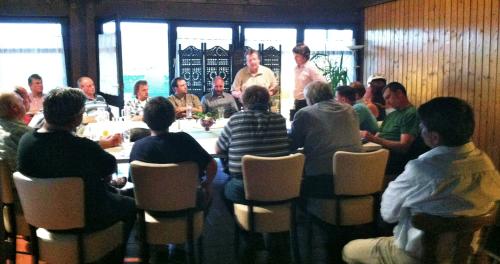 Heiko Wilhelm (stehend rechts) von “Erdwärme Bayern” erklärt rund 30 zunächst erbosten Berger Landwirten die Geothermie und sein Vorhaben