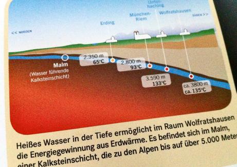 In ca. 4 km Tiefe fließt unter uns ein Schatz: 135 Grad warmes Wasser (Ausriss aus dem Infofaltblatt der “Erdwärme Bayern”)