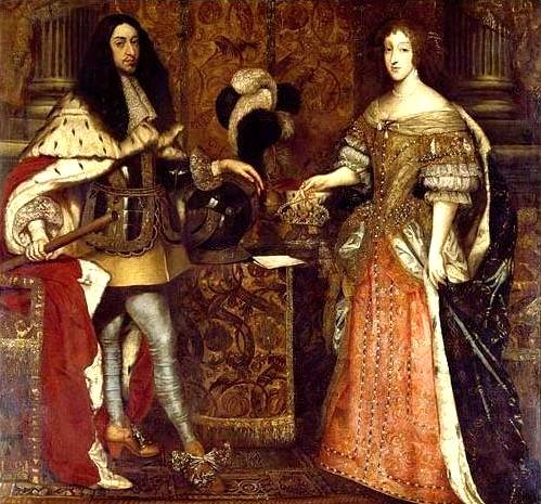 Kurfürst Ferdinand Maria von Bayern – genannt der Friedliebende – mit seiner Gemahlin Henriette Adelaide (Gemälde von Sebastiano Bombelli 1666). Wer solche Schuhe trägt, hat auch andere schrille Ideen.