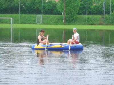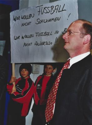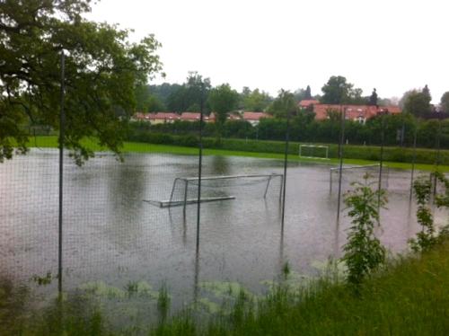 Aber sie machten schon immer was draus. Nicht nur nutzten sie bei Hochwasser – wie hier im Jahr 2010 – den überfluteten Trainingsplatz für eine Bootstour, sie wurden – wie damals im Jahr 2003 – auch politisch aktiv, um die Trainingsbedingungen zu verbessern.