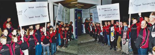 So kam es, dass am 13. März 2003 vor dem Rathaus eine unangemeldete Großdemonstration stattfand. Die Verhandlungen der Lokalpolitik scheiterten damals leider. Erst mehrere Jahre später gelang es auf Initiative des MTV und mit Unterstützung der Gemeinde, am Huberfeld das Sportgelände Berg Nord auszuweisen. Dort befinden sich heute ein Kunstrasenplatz, ein Bogenschützenareal, das DFB-Minispielfeld, für das sich Oliver Bierhoff mit eingesetzt hatte, und auch die Skater haben eine Heimat gefunden.