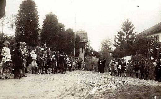Dann hat eines der Schulkinder etwas aufgesagt. Oberlehrer Schuster steht stolz hinter ihr.