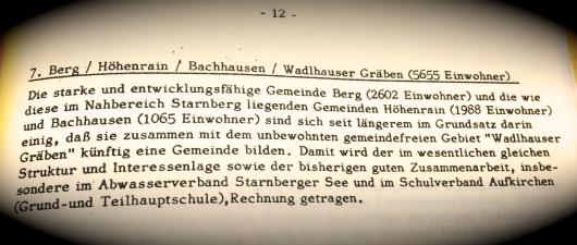 Am 27. Juli 1973 schreibt das Landratsamt an die Gemeinden Berg, Bachhausen, Höhenrain einen folgenreichen Brief. Eine Gebietsreform stehe an, in dessen Zug die Gemeinden Berg, Höhenrain und Bachhausen, sowie das unbewohnte, gemeindefreie Gebiet “Waldhäuser Gräben” (!) zusammengelegt werden sollen.