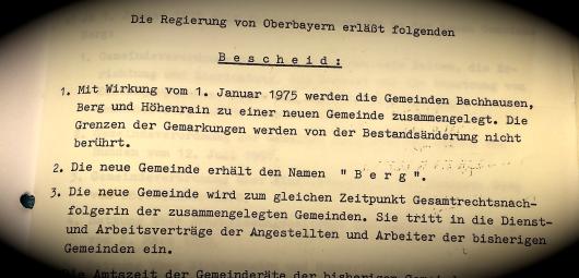 Am 16. Dezember 1974 ging dann der offizielle “Bescheid” der Regierung von Oberbayern ein. Seit 1. Januar 1975 gilt: ““Die neue Gemeinde erhält den Namen ‘B e r g'”: