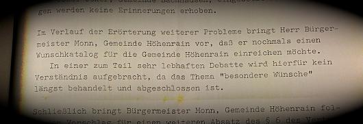 Am längsten wehrte sich die Gemeinde Höhenrain. Ein Jahr später, am 22. Juli stimmt man dort im Gemeinderat ab. Der Antrag zur Zusammenlegung wird mit 7:5 Stimmen abgelehnt. 5 Ratsmitglieder verlassen unter Protest den Saal. 9 Tage später tagt trotz des Votums der gemeinsame Ausschuss der Gemeinden: In der Diskussion “bringt Herr Bürgermeister Monn, Gemeinde Höhenrain (Jacob, der Vater; Anm,. d. QUH) vor, daß er nochmals einen Wunschkatalog für die Gemeinde Höhenrain einreichen möchte. In einer zum Teil sehr lebhaften Diskussion wird hierfür kein Verständnis aufgebracht, da das Thema “besondere Wünsche” längst behandelt und abgeschlossen ist.”