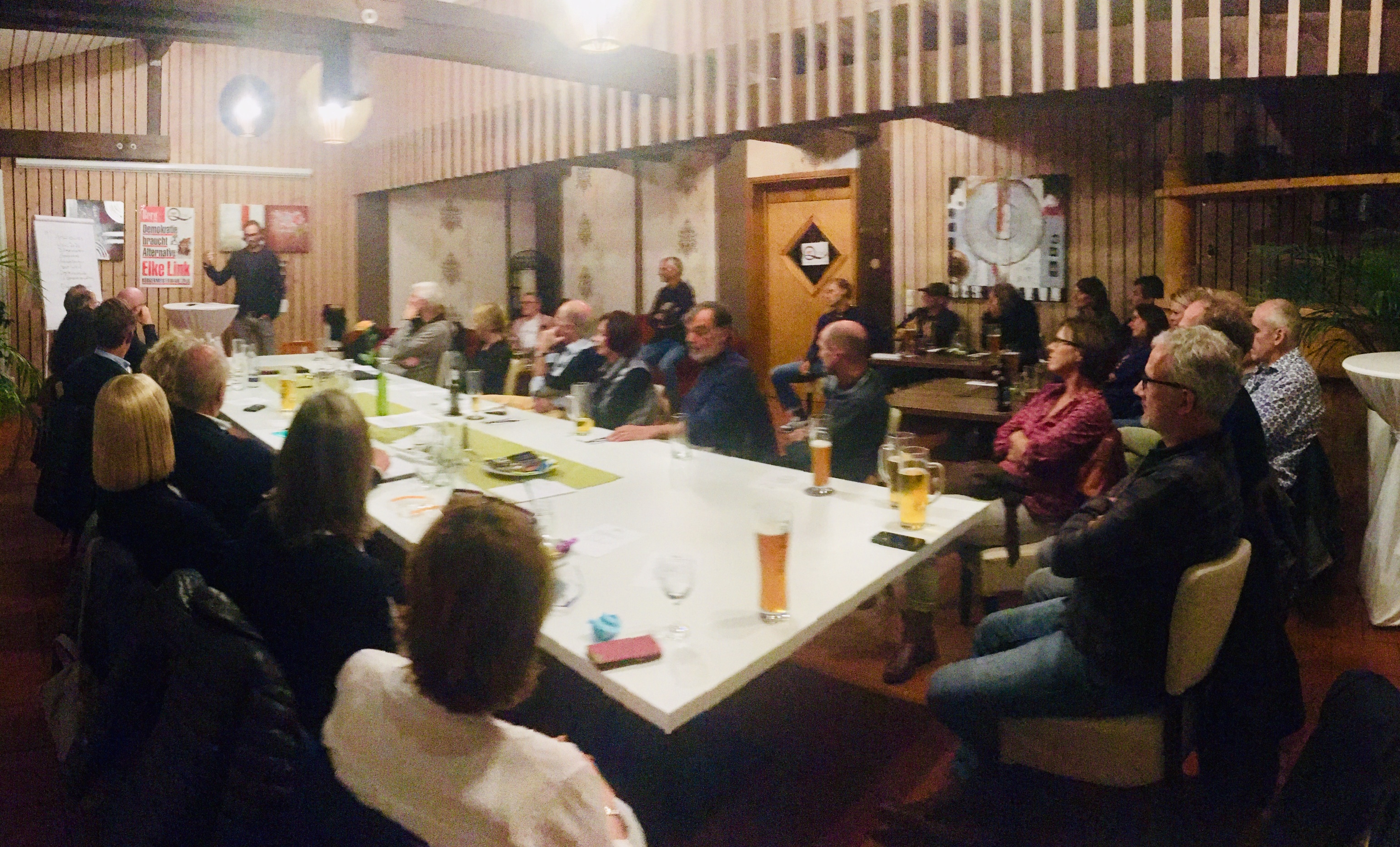 Blick in den gut gefüllten Saal von “Müllers auf der Lüften” – es mussten zusätzliche Stühle aus dem Gastraum gebracht werden – hier das Impulsreferat von Gregory Endres zu Nachhaltigkeit und CO2-Bilanz