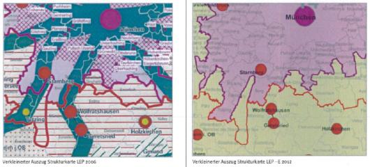 Außerdem auf der Tagesordnung: Der Landesentwicklungsplan, der den Gemeinden viel weniger Mitsprache bei der Ortsgestaltung zugesteht, weil die Zuständigkeiten für Genehmigungen vom Starnberger Landratsamt auf die Regierung von Oberbayern verlegt werden sollen. Das Gemeindegebiet von Berg würde dann (in der Grafik rechts im Bild) dem “Verdichtungsraum” München zugeschlagen werden.