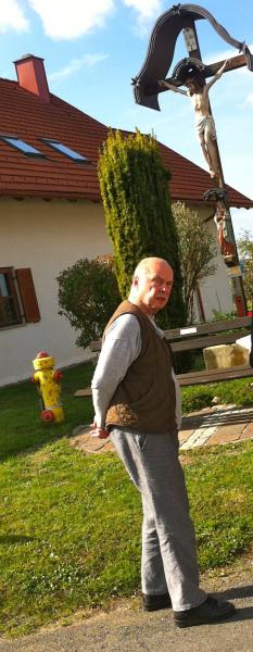 Als Textdarbieter der ehemalige Staatsfeind Oswald Wiener, Vater von Sarah Wiener und Verfasser des Avantgarde-Romans “Die Verbesserung von Mitteleuropa. Roman”; auf dem nebenstehenden Photo vor seinem hauseigenen Kruzifix in der tiefsten Steiermark. An den elektronischen Instrumenten der famose Console.