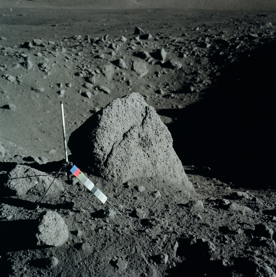 Der Mond mit menschlichem Relikt (Photo von Apollo 17 bei der letzten Mondlandung / 1972)