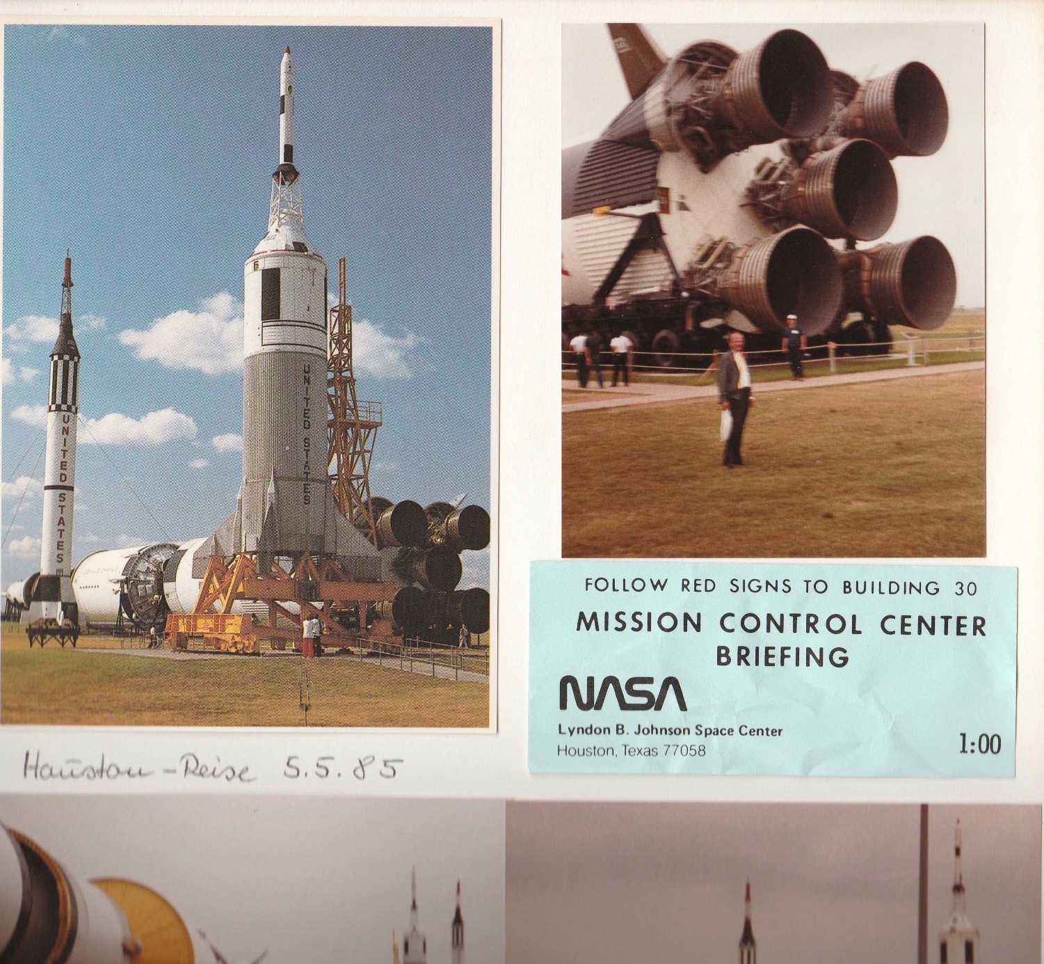 “… (siehe Bild, im Lyndon B. Johnson Space Center Houston, Texas 1985), dann das Umkreisen des Erdtrabanten und die Landung der Mondfähre waren für mich utopisch. Vielleicht verschlug es mich deshalb zur Firma MAN-Neue Technologien, in der ich als Qualitätssicherungsingenieur in der Raumfahrt und verantwortlich für das Schubgerüst und den Wassertank der ersten Stufe der Europarakete ARIANE tätig war.”