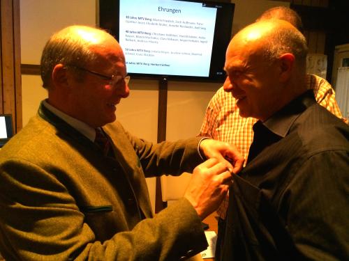 Nach den Kassenberichten, der Kassenprüfung und den Berichten aus den einzelnen Abteilungen ging es an die Ehrungen. BGM Monn heftete die Nadeln für die 30-, 40-, 50-jährige Mitgliedschaft an.