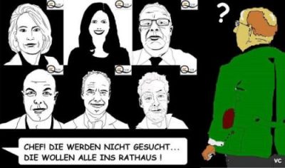 Auf unsere Frage antwortete er: “Zum Stichwort ‘Alles in Ordnung?’ ist mir die Raute von Frau Merkel in den Sinn gekommen.