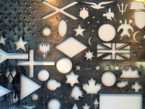 Philipp Messners Thema ist die Wahrnehmung visueller Codes im Zeitalter der Globalisierung. Auf einer Stahlplatte versammeln sich Nationalflaggen, politische Embleme, Symbole, die – zuvor – in einem “performativen Akt” herausgelasert und an eine Wand geworfen wurden. Zurück bleibt ein Musterbogen mit reduzierten Codes, deren ursprüngliche Bedeutung ad absurdum geführt wird.