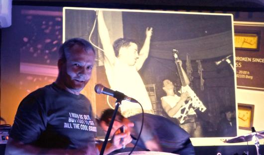 Vor 30 Jahren war Jörn (auf dem Bild im Vorder- und im Hintergrund mit Gitarre) in der längst abgerissenen Berger Turnhalle aufgetreten. Stargäste des Abends waren damals die damaligen Berger Punker von A + P gewesen, dank Major-LP und “Dachau”-Skandal damals richtig ein bißchen berühmt. Noch 2012 war es bei ihrem Abschiedskonzert in Münchner Feierwerk zu Ausschreitungen im Publikum gekommen ( /?p=2893/ ).