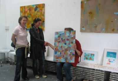 Elke und Elke überreichen den QUH-Ateliertagepreis in Gestalt eines feuchten Händedrucks an Juschi Bannaski