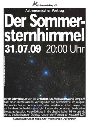 Ulrich Schmidbauer, dritter Vorsitzender des Vereins Christian-Jutz-Volkssternwarte Berg e.V. (sehr schöne Homepage übrigens, mit tollen Fotos!) holt Ihnen heute Abend für nur fünf Euro die Sterne vom Himmel. Er erklärt die im Sommer zu sehenden Sternbilder, die sogar schon mit einem gewöhnlichen Fernglas zu betrachten sind – um 20 Uhr im Kulturraum der Oskar-Maria-Graf-Schule Aufkirchen. Veranstalter: Kulturverein Berg.