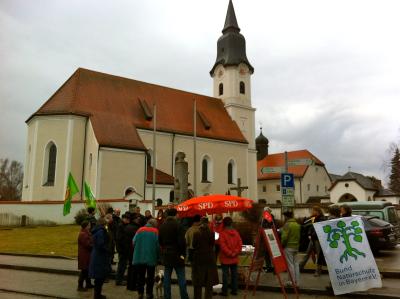 Wie groß (und merkwürdig) die Allianzen inzwischen sind, zeigte sich auch daran, dass der sonst nicht im Rote-Socken-Verdacht stehende Berger Bürgermeister samt “Atomkraft? – Nein danke!” Sticker am Revers wohl zum ersten Mal in seinem Leben an einer Anti-Atomkraft-Demo teilnahm. Mehr noch: Er gehörte sogar – von Sissi dazu eingeladen – zu den Rednern auf der SPD-Veranstaltung (Immer rätselhafte SPD). Der EUW-Kandidat für die nächste BM-Wahl ergriff gerne die kleine Gelegenheit und berichtete, dass am nächsten Dienstag in nicht-öffentlicher Sitzung der Gemeinderat weiter über die Form der Betreibergesellschaft für die 4 Berger Windräder beraten wird. Eine Beteiligung der Bürger an den Windrädern sieht er persönlich – ebenso wie die Beteiligung der Gemeinde an der Höhenrainer Photovoltaikanlage – hingegen als weniger dringlich an.