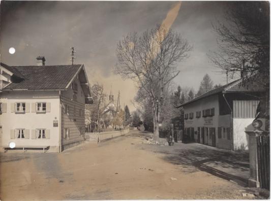 Die Ortsmitte von Berg, die heutige Grafstraße ohne Jeeps und Asphalt. “Ortspartie in Oberberg” steht handschriftlich auf der Rückseite dieses Photos. Außerdem ein Stempel: “Verkehrs-Verband Starnbergersee e.V.”. Keine Jahreszahl. Es lohnt sich genauer hinzusehen: